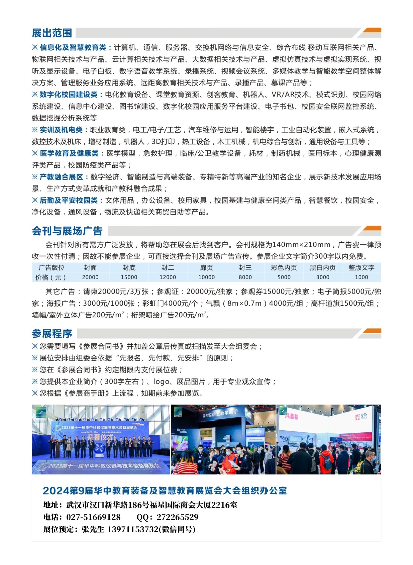 2.2024华中教育装备展将扩邀各类学校对口部门老师前来参加采购交流,由信息化处(办、中心)、教务处、教学仪器装备中心/站、电教馆/中心、现代教育技术中心、网络中心、会议中心、管理信息中心、基础教育资源中心、图书馆、实训中心、产教融合院系、后勤(部)中心、招标中心组成负责人或技术人员前来观摩采购。